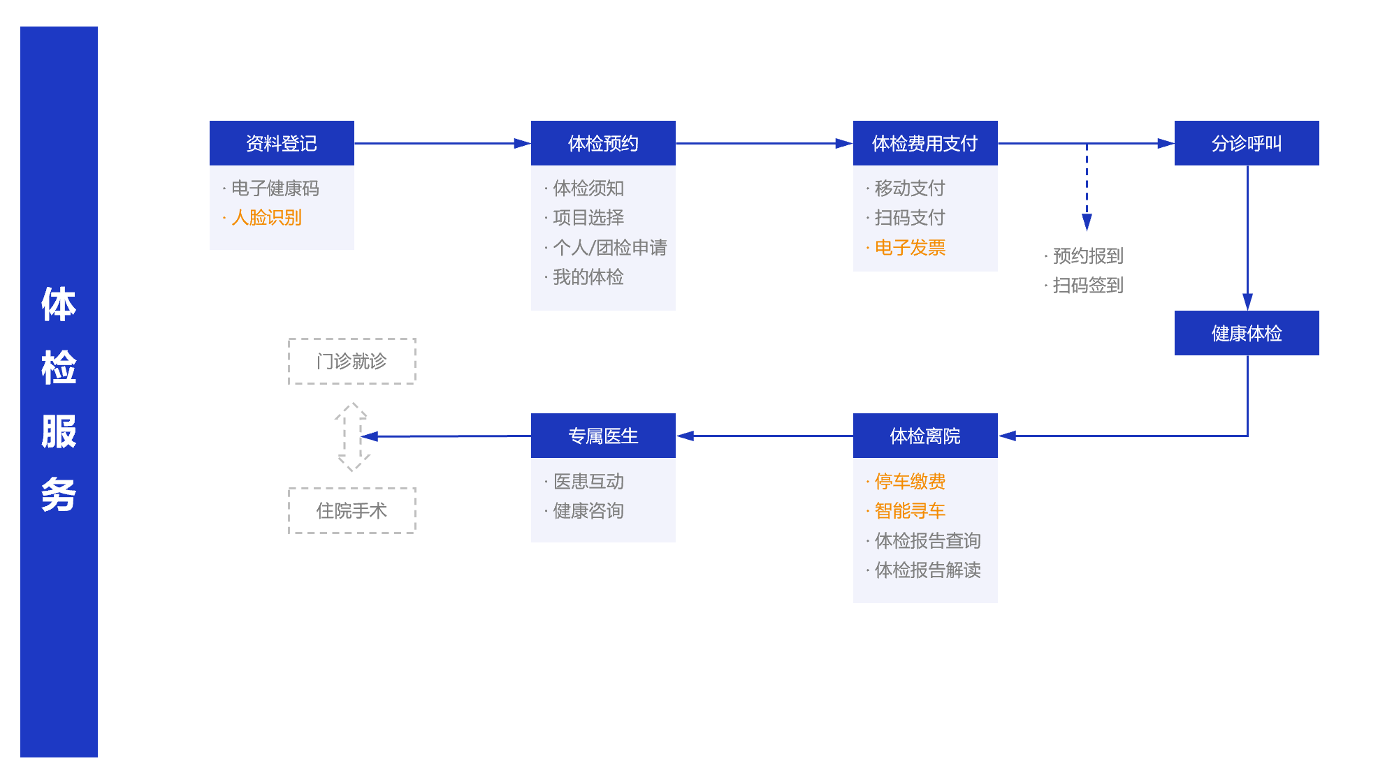 体检客户通过手机即可自助获取医院体检预约、套餐选择、费用支付、报告查询、体检须知等全流程体检服务,为客户提供更加便捷、人性化的医院体检体验。